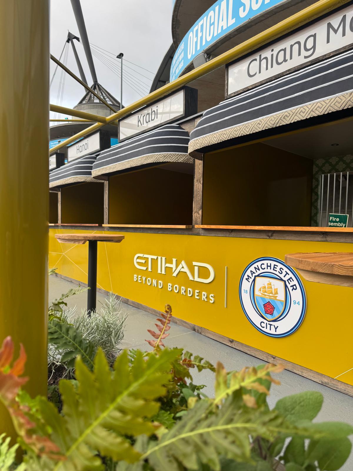 The creative direction centred on transforming match day into a live Etihad experience, where fans could connect with the airline’s new destinations in a dynamic, shareable way. The pergola acted as a unifying structure, elevating the kiosks into a premium, destination-themed food market. Each kiosk was styled to reflect its corresponding location through colour, branding, and cuisine, while stainless steel counters and weatherproof materials ensured both practicality and polish. At the heart of the design was the interactive voting wall, encouraging participation, sparking conversation, and reinforcing Etihad’s global brand through a gamified, memorable fan experience.