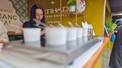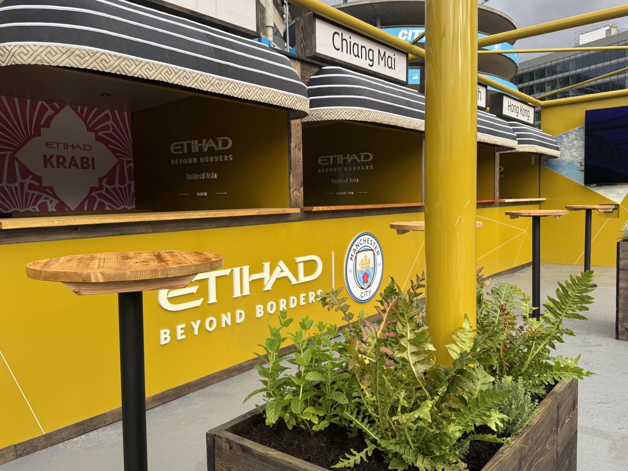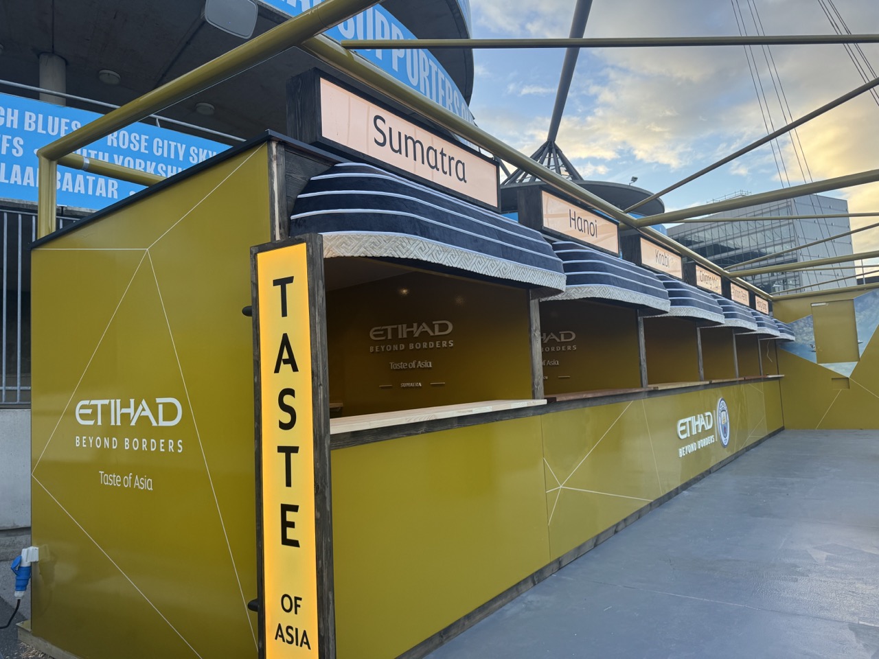 Project Execution Stackd Productions led the full project management, procurement, and installation of the kiosks, coordinating with a wide network of suppliers including metalworkers, upholsterers, and vinyl specialists. The activation was unified under a custom aluminium frame pergola, finished in Etihad’s branded gold, which created a striking architectural canopy for the takeover. Each kiosk featured stainless steel counters, weatherproof construction, and destination-themed vinyl wraps, while illuminated lightboxes highlighted the six global destinations. To increase fan engagement, we designed and installed an interactive voting wall with integrated iPad voting and live TV screen results, allowing supporters to vote on their favourite country’s cuisine, merging experiential storytelling with a high-profile sporting moment.